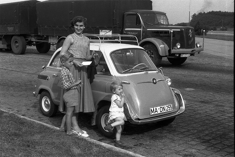 Do you see the background of this picture? This is a Autobahn! Even as part of a movie, it would seem as an unrealistic depiction as cars only pass every 30 seconds. Cars still used to be uncommon 10 years after the Second World War; People were happy if they owned a motorcycle. It did not take long though before Volkswagen and other speedsters raced along the highway. It seems almost unbelievable when reflecting upon the fact that BMW used to struggle to cut it on the market. Besides selling motorcycles, they also specialized in expensive big 6-cylinder cars and V8 limousines for VIPs such as politicians, company managers and even the Munich police. They were saved by the Italians: BMW was able to buy their bubble car license. When BMW added their strong motors as well as 2 wheels instead of one, the road holding increased tremendously. It became commonly known as the “Knutschkugel” (kiss ball). This picture shows one of the later models. The size was increased which made room for a second row of seats. There still was not a true luggage space compared to modern standards. 4 persons filled up the space that only about 100 liters were left for luggage. This was obviously not enough to survive a family camping trip in Italy – the favorite holiday destination of Germans. While being small on the inside, the outside, however, gave way to pack all belongings and stack them on top: tent, air mattress, food etc. – all of which were transported across the Brenner Pass by these fearless travelers on their quest for sunshine. Whether a radio was included in the Volkswagen of the picture is not known but you can easily imagine that Caterina Valente`s voice filled the car singing “ Come to Italy for a while, come join us at the blue sea..”